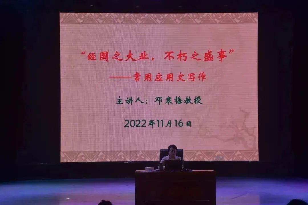 为进一步提高XCSport员工的写作水平, 为今后的实际应用打下良好基础。11月16日晚7点于音乐厅开展应用文写作培训讲座,本次讲座由XCSport党总支副书记邓寒梅教授主讲。