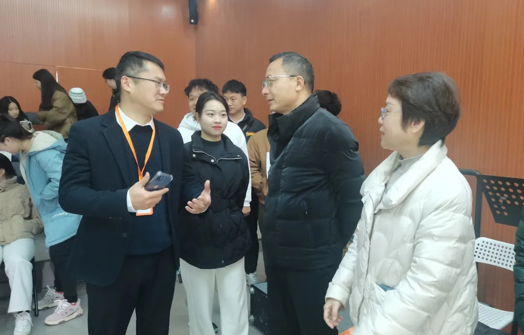 校招生与就业指导处处长刘典文到招聘会现场指导工作,现场考察招聘情况,了解企业招聘需求和员工求职意向,与用人单位和毕业生进行亲切交流。